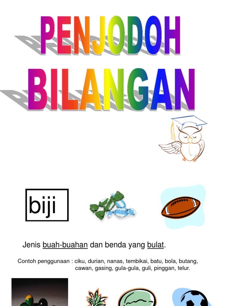 Penjodoh bilangan digunakan untuk menentukan sesuatu benda. Baca versi flipbook dari penjodoh-bilangan. Buah-buahan yang mengandungi biji.