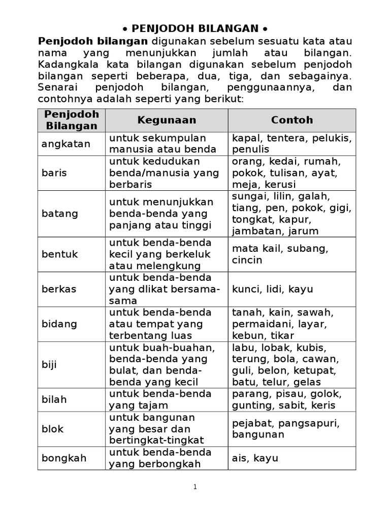 PENJODOH BILANGAN 39 Dia menggunakan _____ tanah liat untuk dijadikan pinggan. Up to 24 cash back Penjodoh bilangan ialah kata yang digunakan bersama-sama dengan kata bilangan. Yang berikut ialah beberapa contoh penjodoh bilangan serta.
